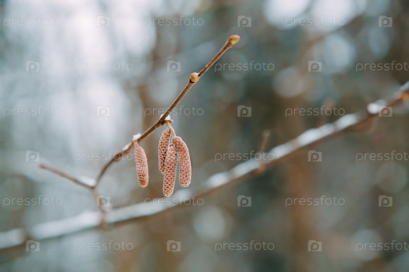 Крупным планом — зимние сережки, элегантно свисающие с ветки дерева на фоне живописного снежного пейзажа