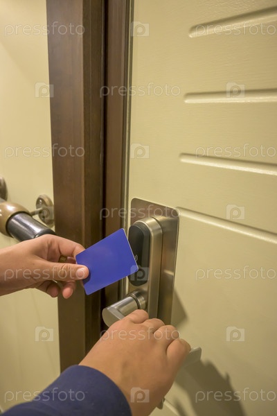 Крупный план руки, использующей синюю карточку-ключ в замке двери отеля, электронный замок с ключом, номер в отеле, отдых на Майорке, Испания,