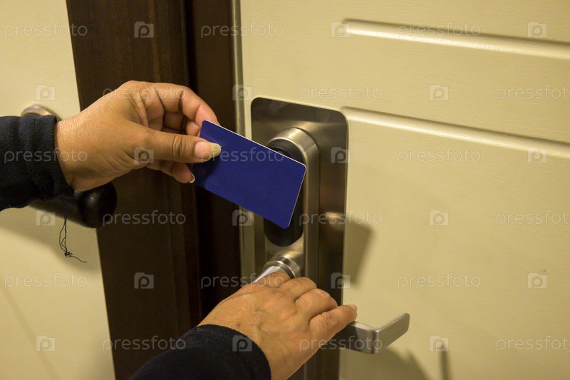 Руки держат ключ-карту возле дверного замка для входа, электронный замок, номер в отеле, отдых на Майорке, Испания,