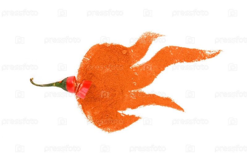 Вид сверху на стручок чили и молотый красный перец, рассыпанный в виде пламени