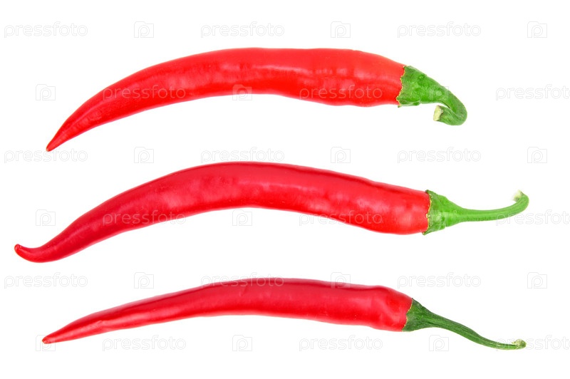 Три стручка красного острого перца чили, разложенные в ряд на горизонтальной поверхности