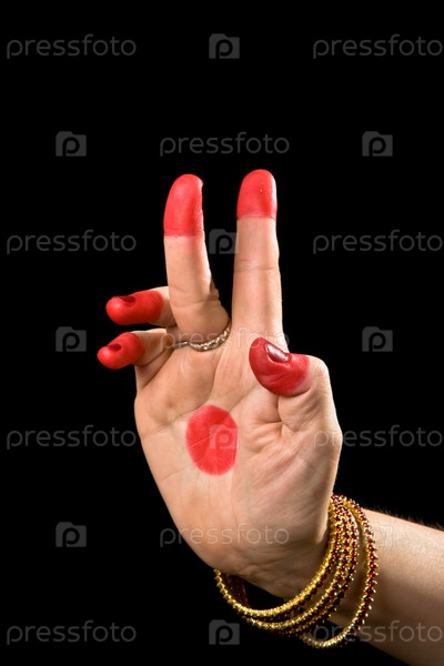 Женская рука показывает Картаримукха хаста (что значит ножницы), классический индийский танец Бхарата Натьям
