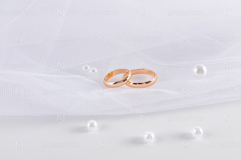Два классических золотых обручальных кольца лежат на белой фате с жемчугом. Нежный фон для свадебного дизайна. Копия пространства. открытка