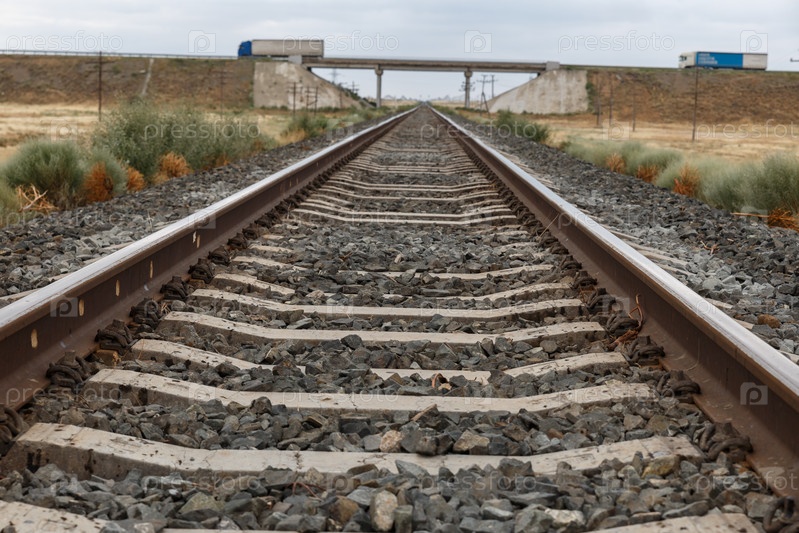 Железнодорожные пути в сельской местности Казахстана. На заднем плане — автомобильный мост
