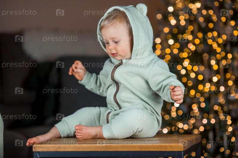 Семья и дети. Красивый белокурый мальчик 1 года на фоне елки. Концепция празднования Рождества и Нового года
