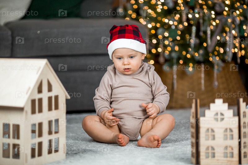 Красивый маленький светловолосый мальчик 1 года в шапке Санта-Клауса сидит на фоне рождественской елки. Концепция празднования Рождества и Нового года