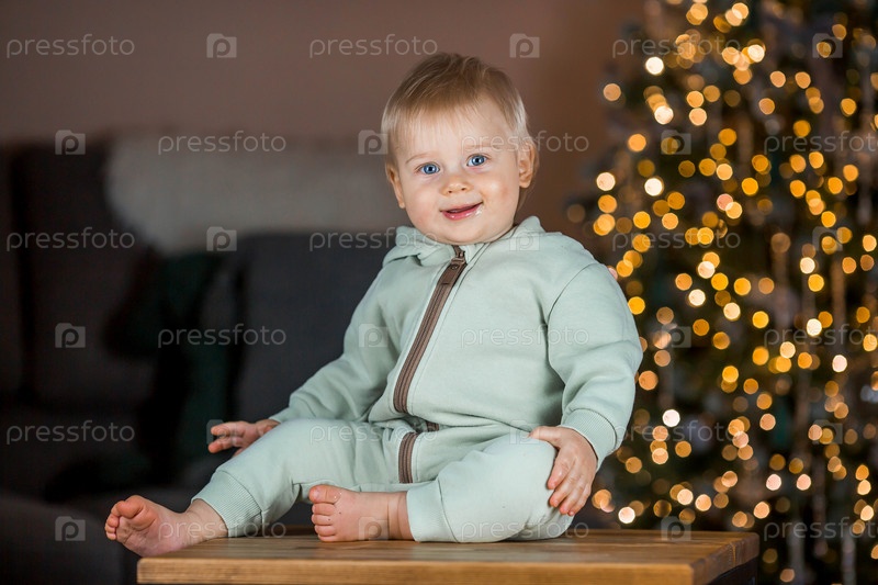 Семья и дети. Красивый белокурый мальчик 1 года на фоне елки. Концепция празднования Рождества и Нового года