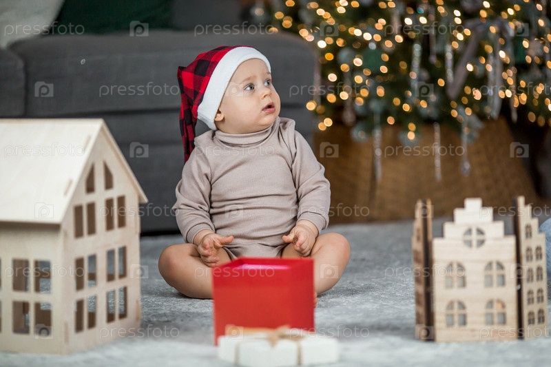 Красивый маленький светловолосый мальчик 1 года в шапке Санта-Клауса сидит на фоне рождественской елки. Концепция празднования Рождества и Нового года