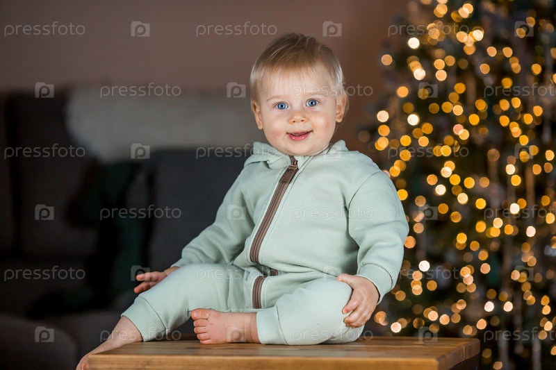 Семья и дети. Красивый белокурый мальчик 1 года на фоне елки. Концепция празднования Рождества и Нового года