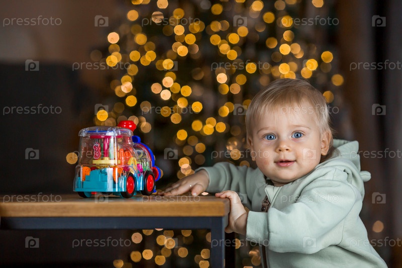 Красивый светловолосый мальчик 1 года с игрушечным поездом на фоне елки. Концепция празднования Рождества и Нового года
