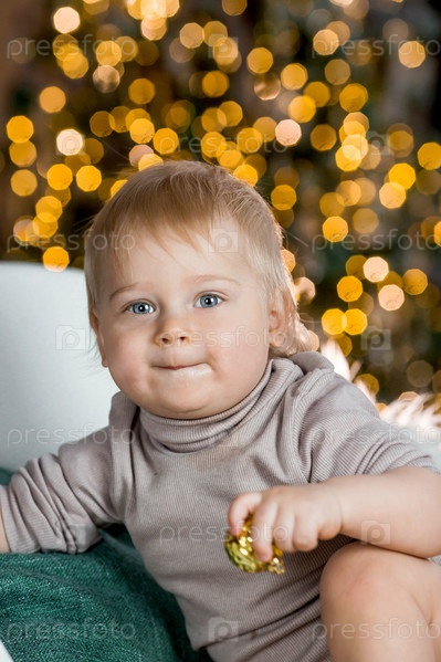 Семья. Красивый маленький белокурый мальчик 1 года сидит на фоне рождественской елки. Концепция празднования Рождества и Нового года
