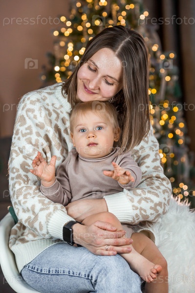 Красивый маленький светловолосый мальчик 1 года сидит с мамой на фоне рождественской елки. Концепция празднования Рождества и Нового года