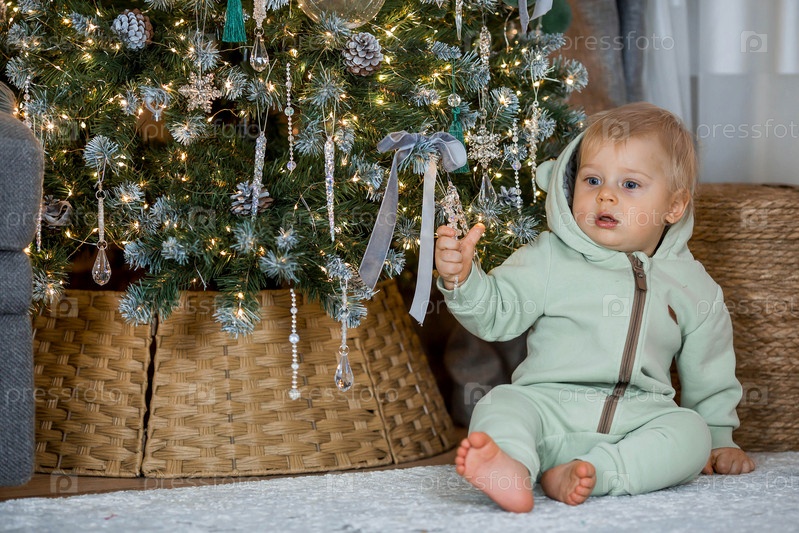 Семья и дети. Красивый белокурый мальчик 1 года на фоне елки. Концепция празднования Рождества и Нового года