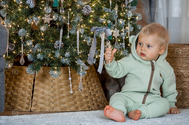 Семья и дети. Красивый белокурый мальчик 1 года на фоне елки. Концепция празднования Рождества и Нового года