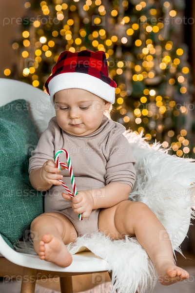 Семья. Красивый маленький белокурый мальчик 1 года сидит на фоне рождественской елки. Концепция празднования Рождества и Нового года