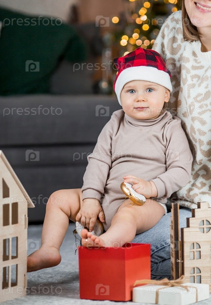 Красивый маленький светловолосый мальчик 1 года сидит с мамой на фоне рождественской елки. Концепция празднования Рождества и Нового года