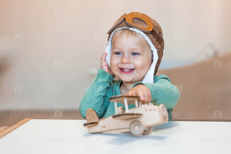 Симпатичный мальчик 2 лет в пилотской шапке играет с деревянным самолетом и конструктором логистики. Детские деревянные игрушки для развития ребенка