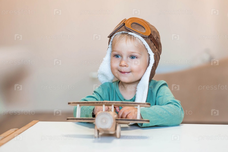 Симпатичный мальчик 2 лет в пилотской шапке играет с деревянным самолетом и конструктором логистики. Детские деревянные игрушки для развития ребенка