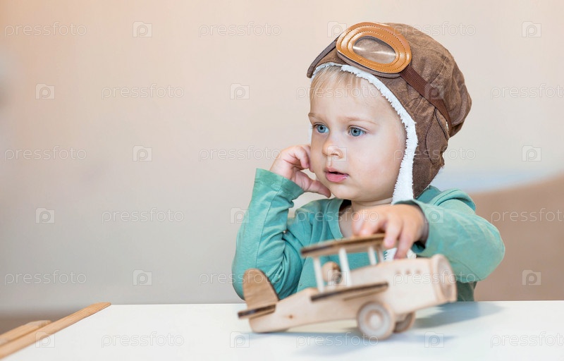 Симпатичный мальчик 2 лет в пилотской шапке играет с деревянным самолетом и конструктором логистики. Детские деревянные игрушки для развития ребенка