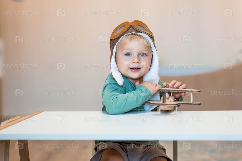 Симпатичный мальчик 2 лет в пилотской шапке играет с деревянным самолетом и конструктором логистики. Детские деревянные игрушки для развития ребенка