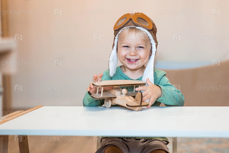 Симпатичный мальчик 2 лет в пилотской шапке играет с деревянным самолетом и конструктором логистики. Детские деревянные игрушки для развития ребенка
