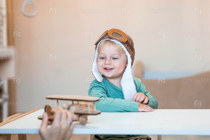 Симпатичный мальчик 2 лет в пилотской шапке играет с деревянным самолетом и конструктором логистики. Детские деревянные игрушки для развития ребенка