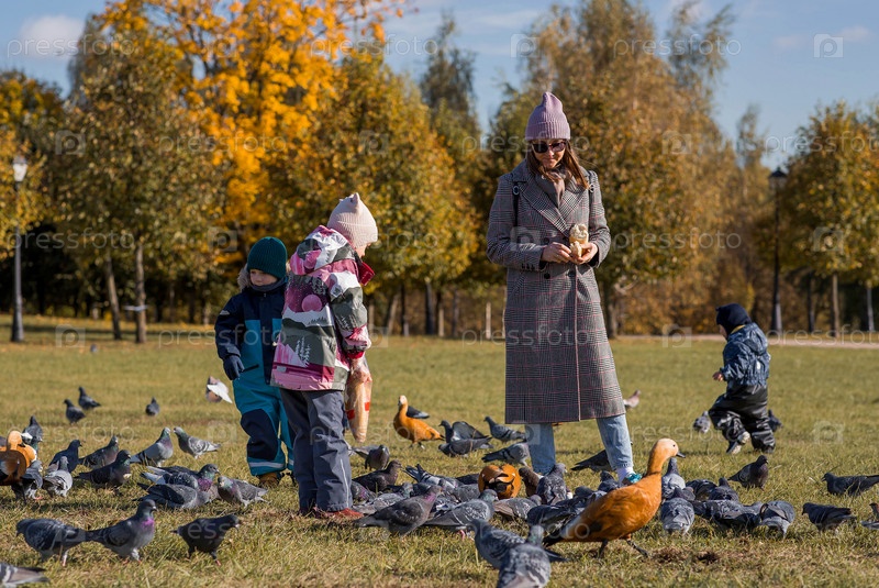 Семья с тремя детьми. Многодетная мать и дети в осеннем парке. Дети играют на улице и кормят голубей и уток. Многодетность и семейные ценности