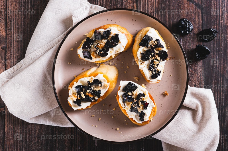 Крупный план вкусных тостов с рикоттой и черносливом на тарелке на столе, веб-баннер, вид сверху