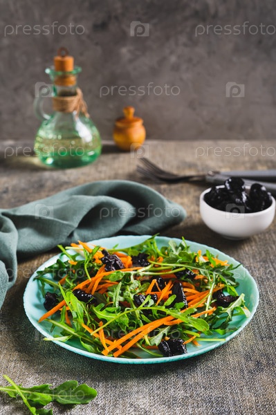 Вкусный салат из моркови, рукколы и чернослива на тарелке на столе вертикальный вид
