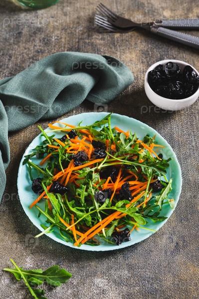 Вегетарианский салат с черносливом, зеленью и морковью на тарелке на столе вертикальный вид