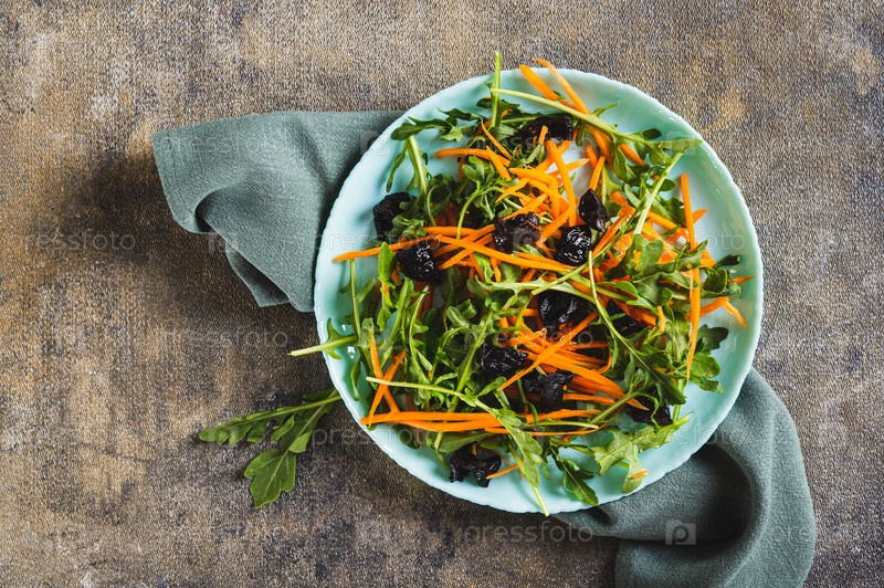 Крупный план вкусного салата из моркови, рукколы и чернослива на тарелке на столешнице