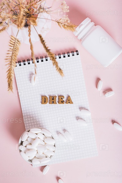 Гормональные добавки в миске, блокноте и бутылке на розовом фоне сверху и вертикальном виде