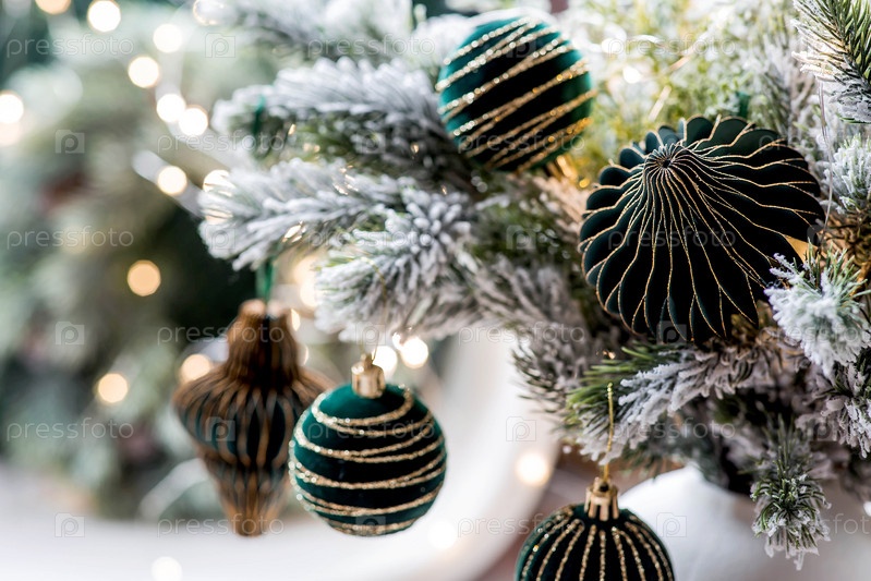 Баннер. Стильные бумажные и бархатные елочные игрушки в скандинавском стиле на еловых ветках. Зеленые тона. Концепция стильного нового года и Рождества 2025