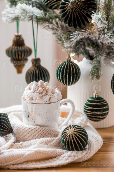 Стильные бумажные елочные игрушки и кофейная кружка со взбитыми сливками и зефиром на деревянном фоне. Зеленые тона. Баннер для оформления веб-страниц
