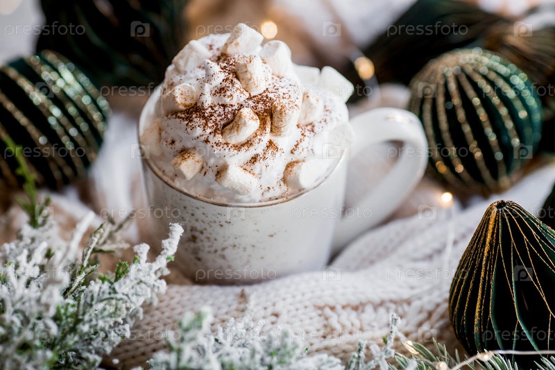 Стильные бумажные елочные игрушки и кружка кофе со взбитыми сливками и зефиром на деревянном фоне. Зеленые тона. Баннер для оформления веб-страниц