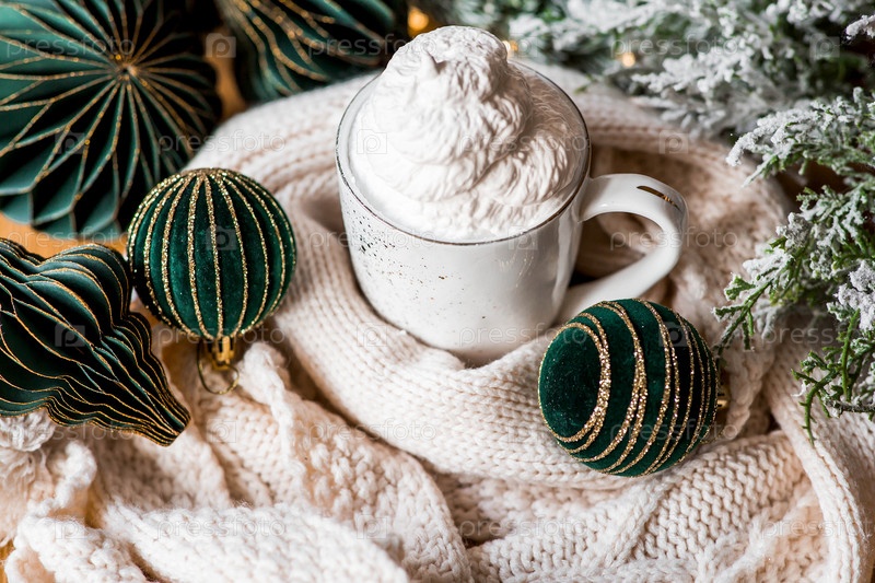 Стильные бумажные елочные игрушки и кружка кофе со взбитыми сливками и зефиром на деревянном фоне. Зеленые тона. Баннер для оформления веб-страниц