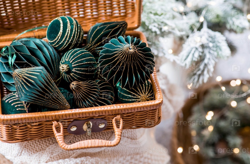 Баннер. Стильные бумажные и бархатные елочные игрушки в скандинавском стиле в плетеном чемодане. Зеленые тона. Концепция стильного нового года и Рождества 2025