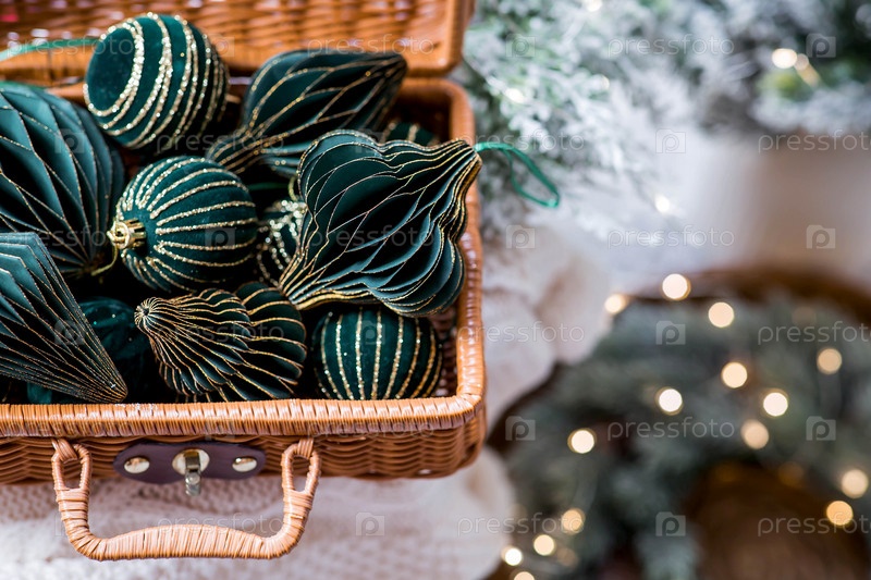Баннер. Стильные бумажные и бархатные елочные игрушки в скандинавском стиле в плетеном чемодане. Зеленые тона. Концепция стильного нового года и Рождества 2025