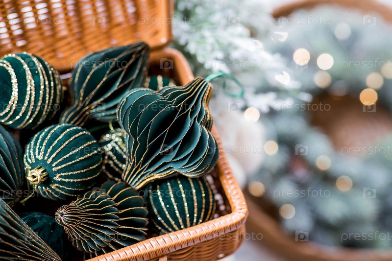 Баннер. Стильные бумажные и бархатные елочные игрушки в скандинавском стиле в плетеном чемодане. Зеленые тона. Концепция стильного нового года и Рождества 2025