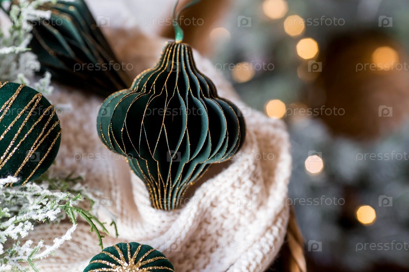 Баннер или красивый фон. Стильные бумажные и бархатные елочные игрушки в скандинавском стиле. Зеленые тона. Концепция стильного нового года и Рождества 2025