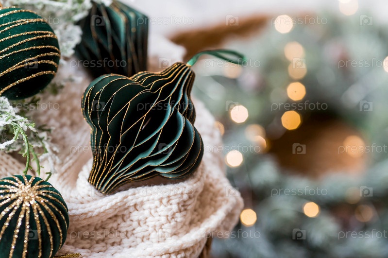Баннер или красивый фон. Стильные бумажные и бархатные елочные игрушки в скандинавском стиле. Зеленые тона. Концепция стильного нового года и Рождества 2025