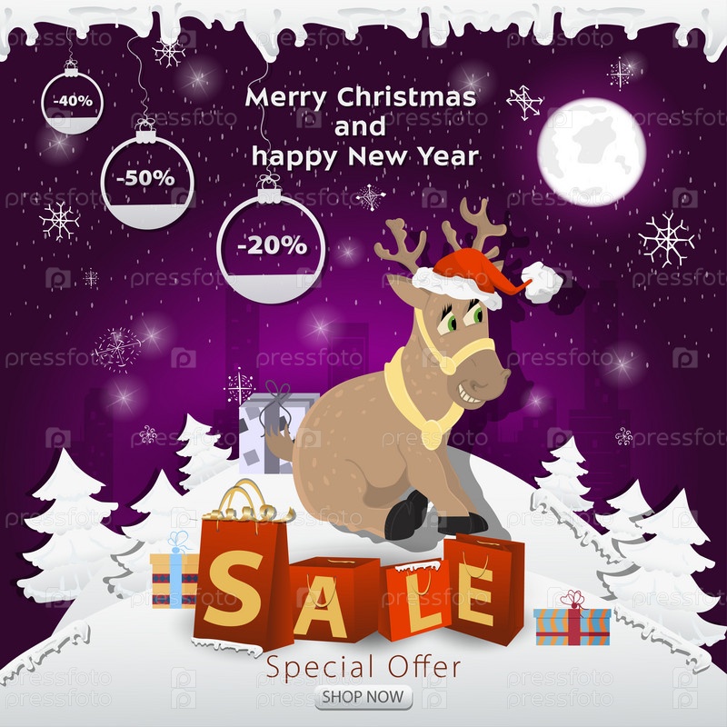 Баннер рождественской распродажи с надписью в виде упаковок на заснеженной поляне оленя в шапке Санта-Клауса