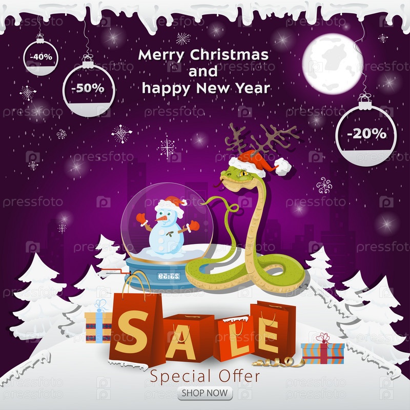 Баннер рождественской распродажи с надписью в виде упаковок на заснеженной поляне, змеи в шапке Санты рядом со стеклянным шаром