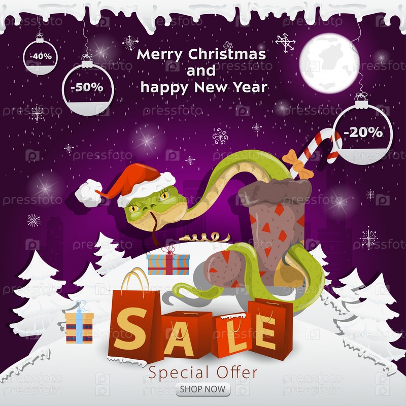 Баннер рождественской распродажи с надписью в виде упаковок на заснеженной поляне. Змея в шапке Санты выползает из носка за подарками