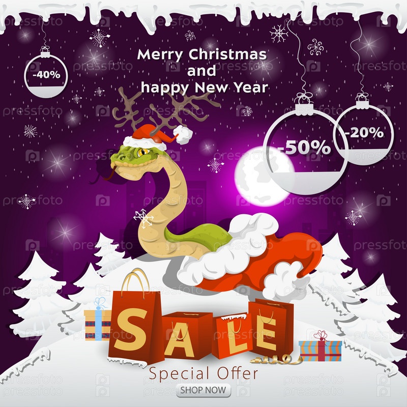 Баннер рождественской распродажи с надписью в виде упаковок на заснеженной поляне. Змея в шапке Санты выползает из шапки Санта-Клауса