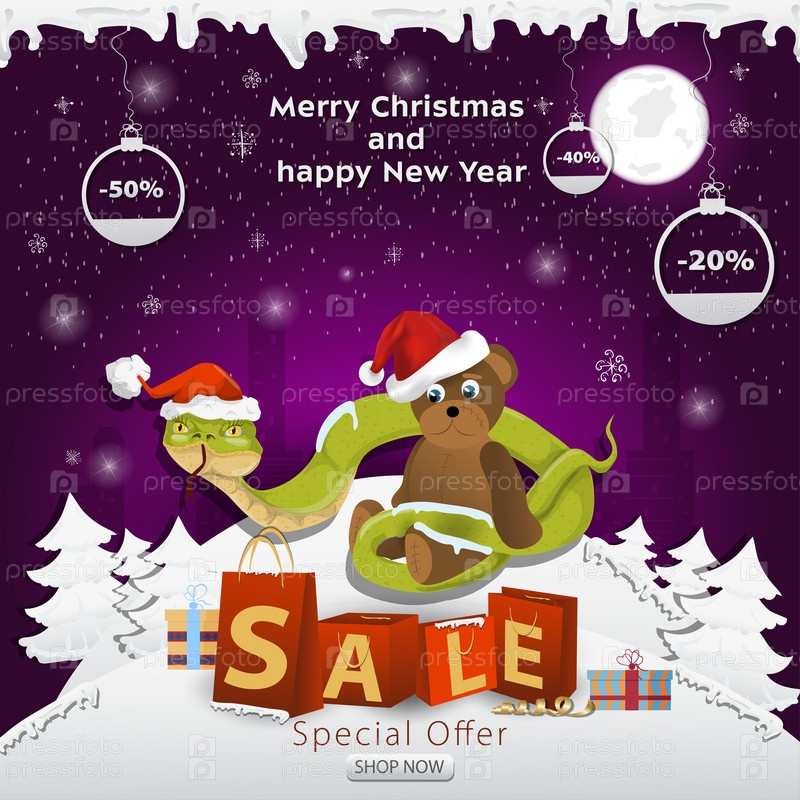 Баннер рождественской распродажи с надписью в виде упаковок на заснеженной поляне. Змея в шапке Санты обвивает игрушку-медведя