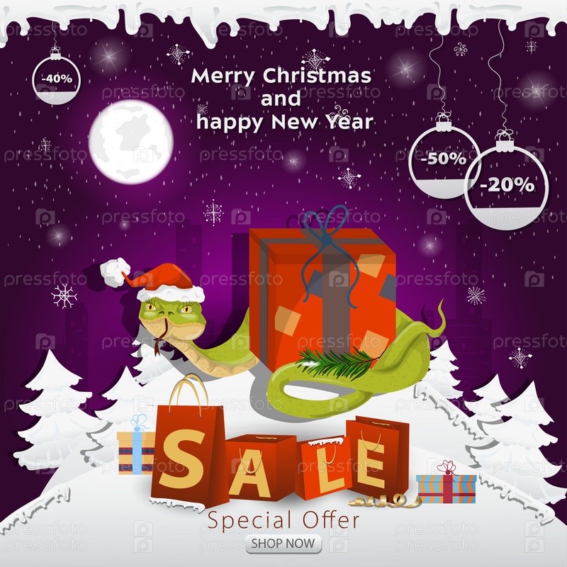 Баннер рождественской распродажи с надписью в виде упаковок на заснеженной поляне, змея в шапке Санты обвивает подарочную коробку