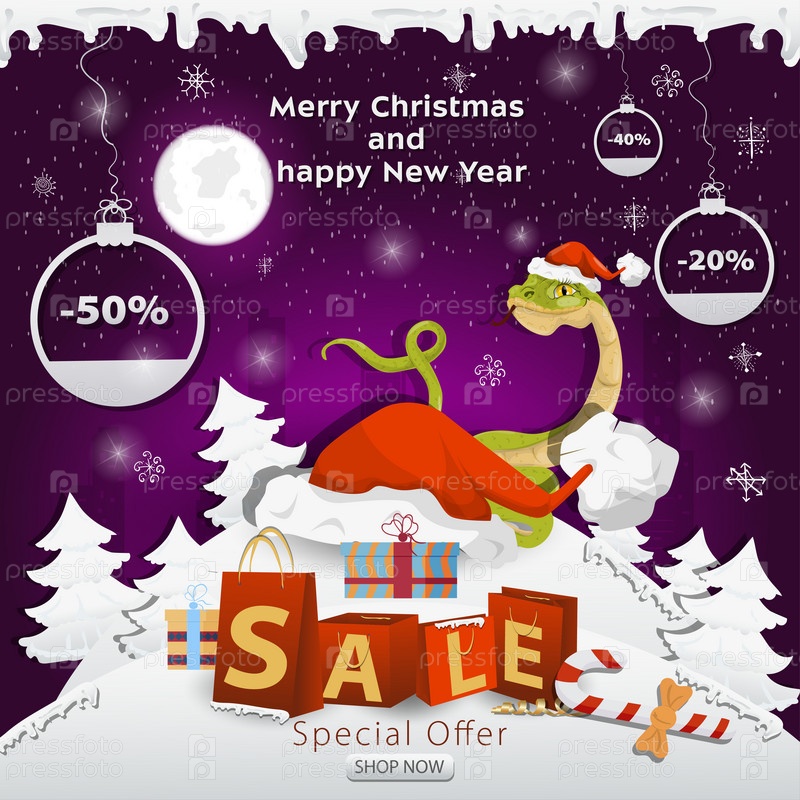 Баннер рождественской распродажи с надписью в виде упаковок на заснеженной поляне, змея выглядывает из-за большой шапки Санты