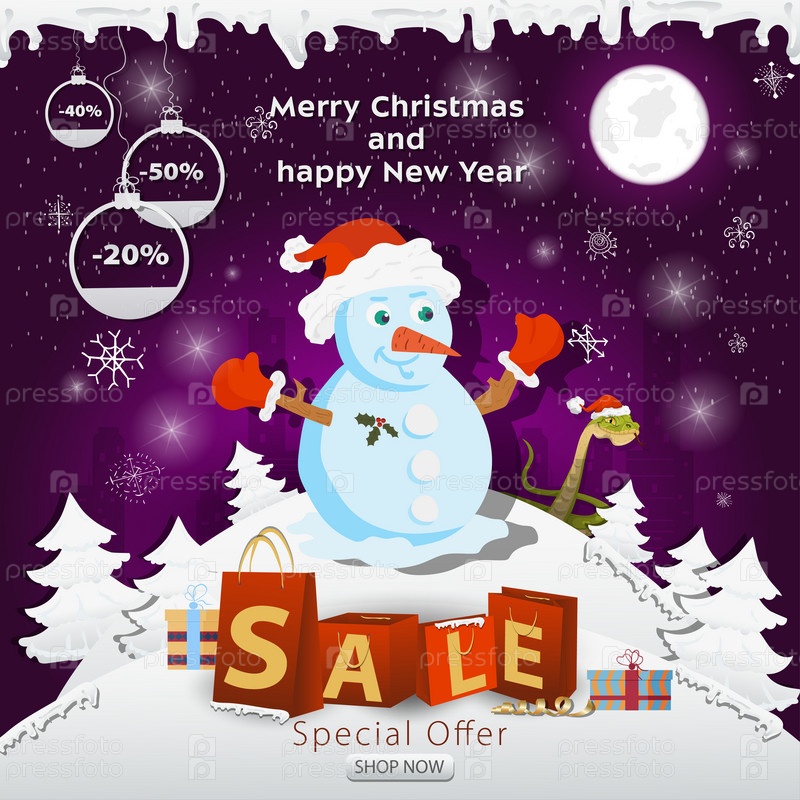 Баннер рождественской распродажи с надписью в виде упаковок на заснеженной поляне снеговик в шапке Санта-Клауса