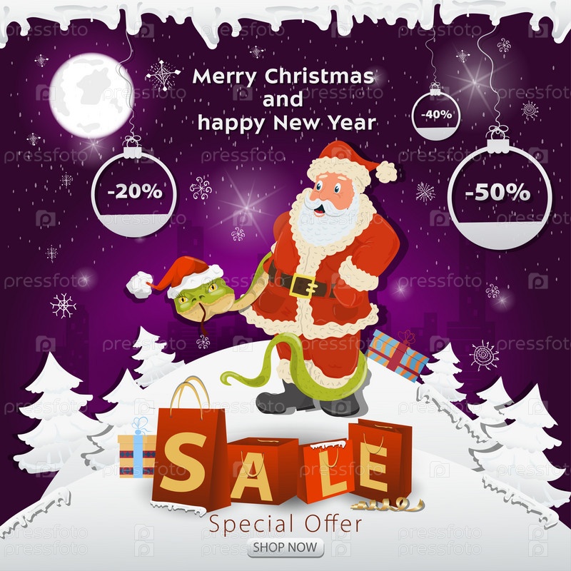 Баннер рождественской распродажи с надписью в виде посылок на заснеженной поляне. Змея в шапке Санты обвивает Санта-Клауса